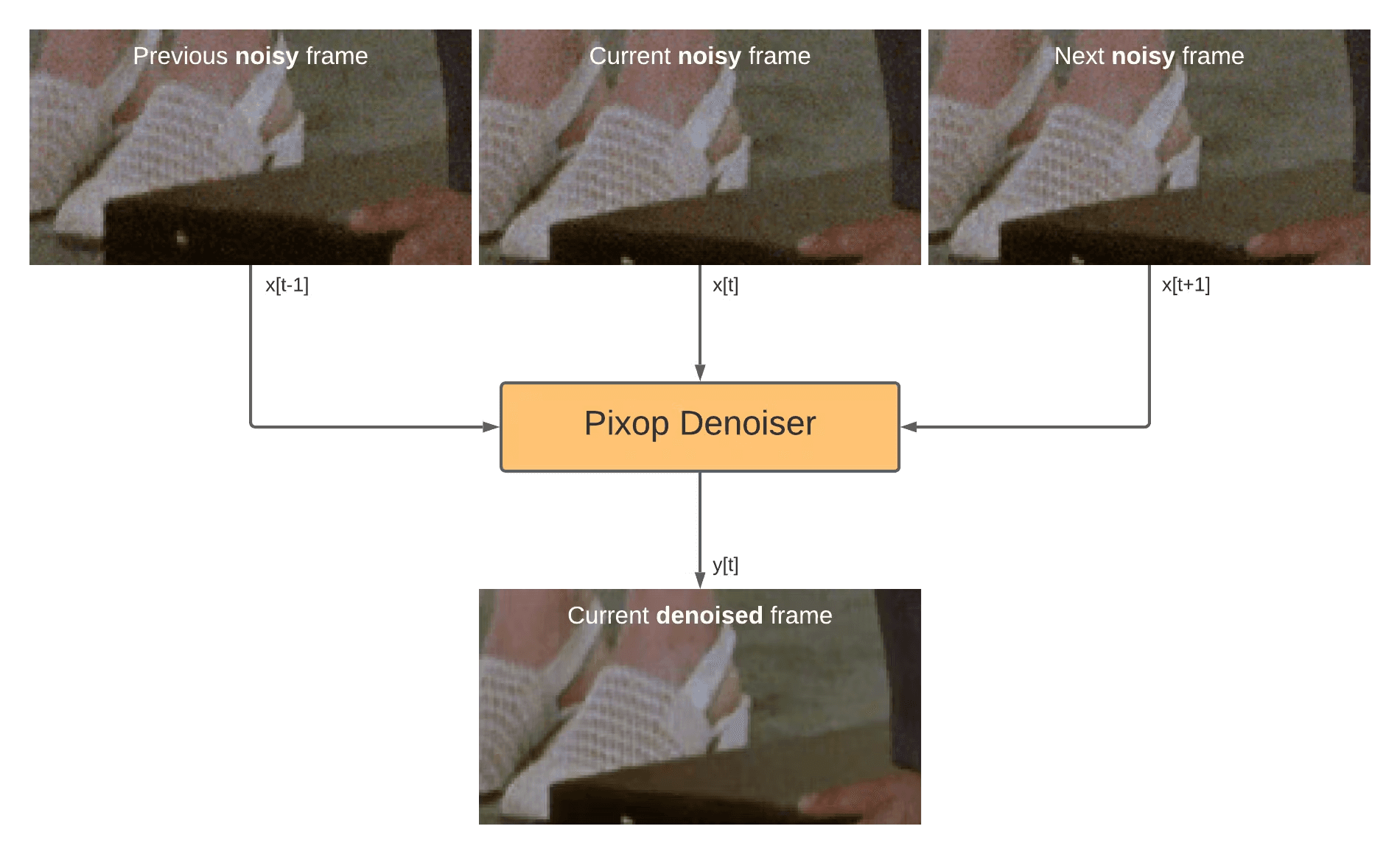 Pixop's Denoiser is based on this principle. Videos are processed frame-by-frame using three video frames (previous, current and next) as input. An enhanced frame is then produced via inference using our pre-trained neural network model. The diagram below is illustrative of the process: