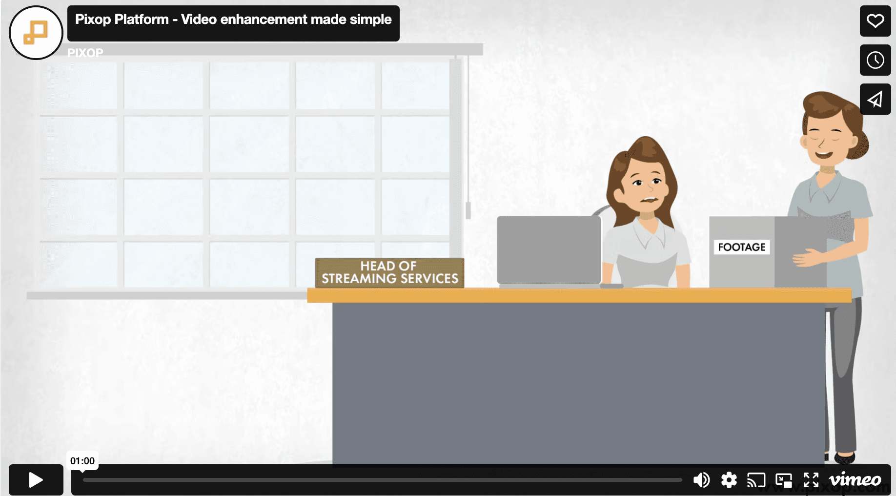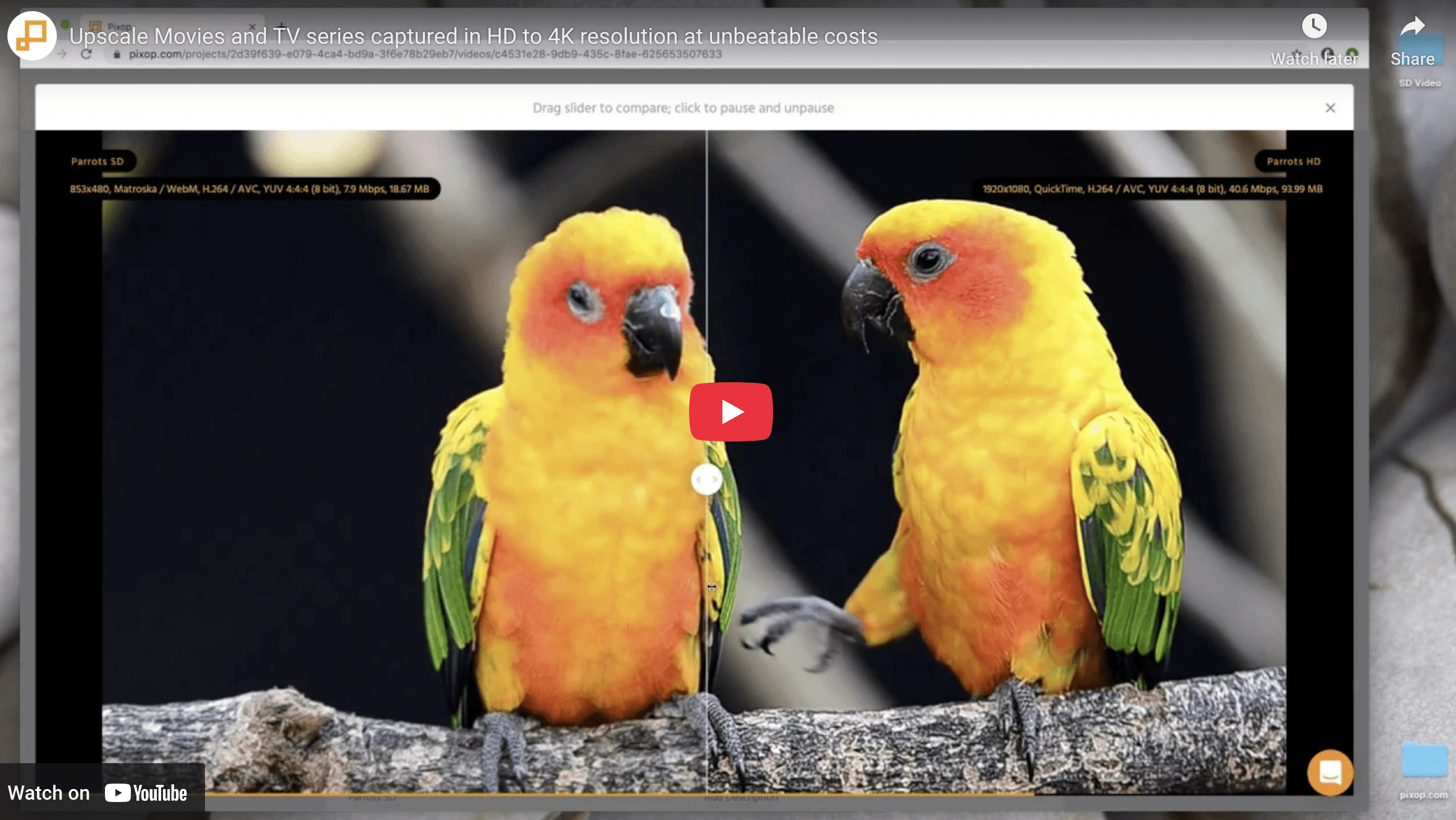 A short demonstration of the typical workflow when using PIXOP Platform: Upload SD video, confirm ingested video quality, upscale SD to HD using PIXOP Super Resolution, evaluate and download result.