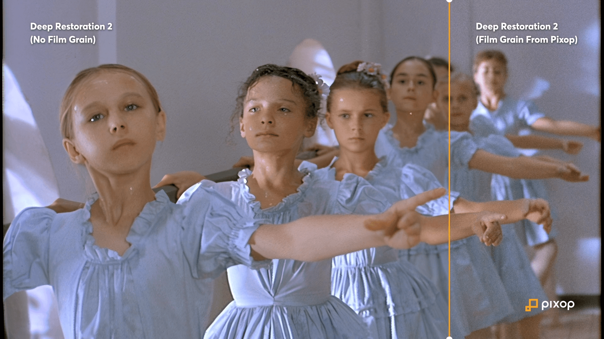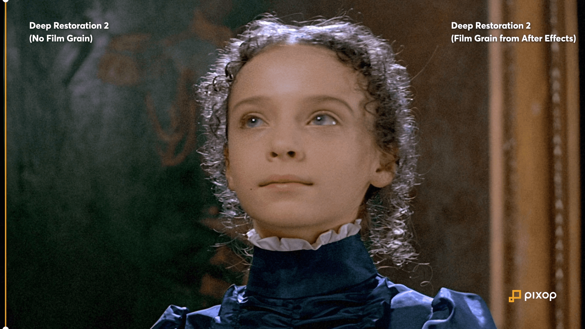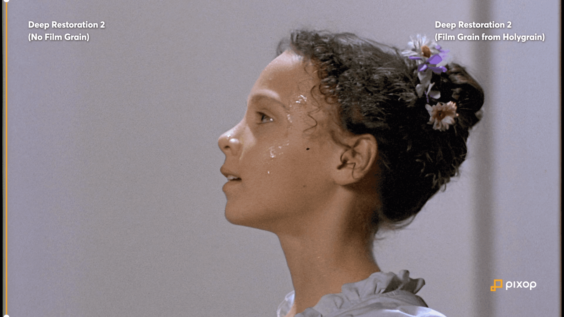 In preparation, we upscaled and enhanced the source material from SD to HD using our Deep Restoration 2 algorithm. Once that was done, we applied three different kinds of film grain among the many options Pixop gives users to create a representative sample of what is possible with our filter.